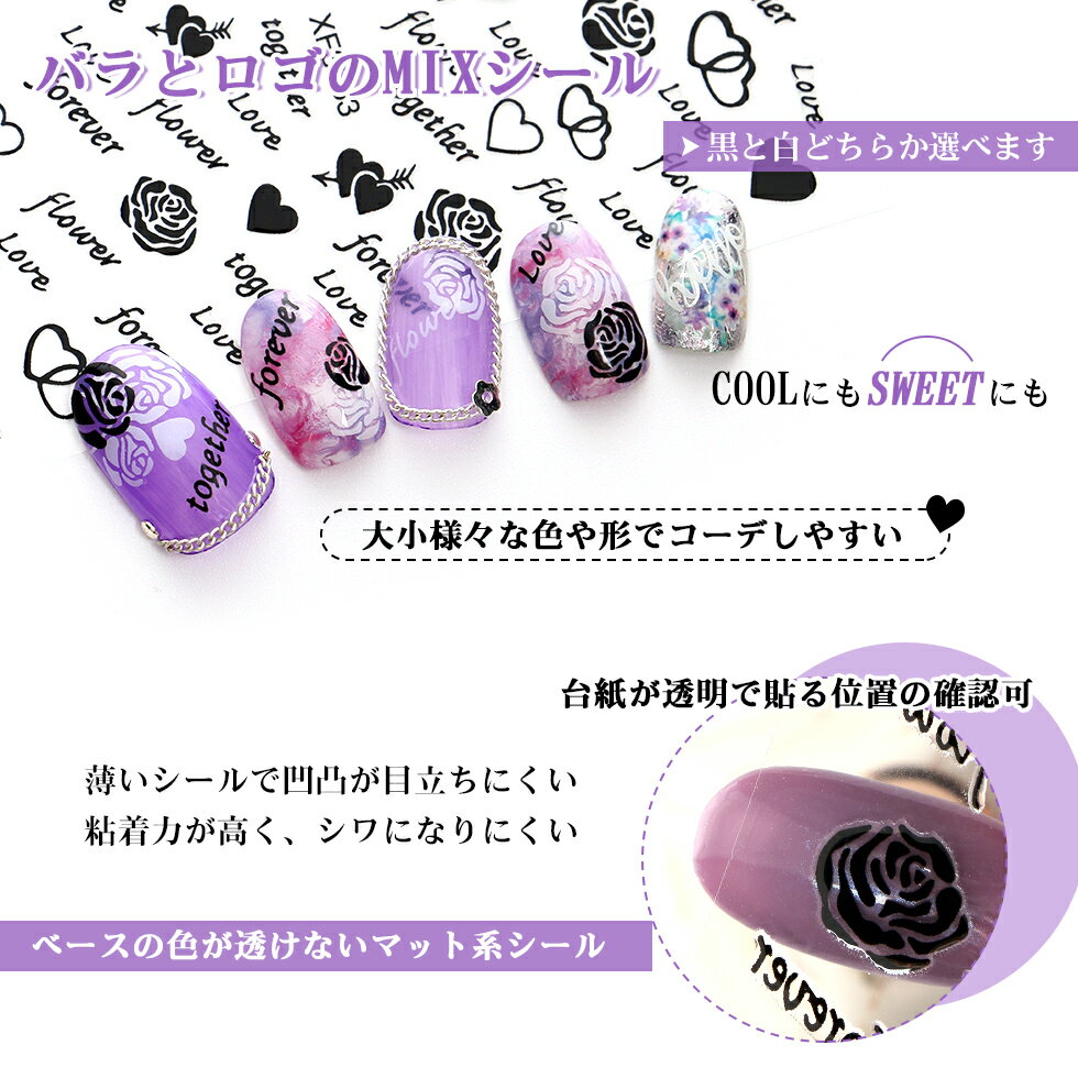 *バラとロゴのMIXシール *黒と白どちらか選べます *COOLにもSWEETにも *台紙が透明で貼る位置の確認可 *大小様々な色や形でコーデしやすい *ベースの色が透けないマット系シール *薄いシールで凹凸が目立ちにくい *粘着力が高く、シワになりにくい 使用法: 1.ベース・カラージェルを硬化させます。